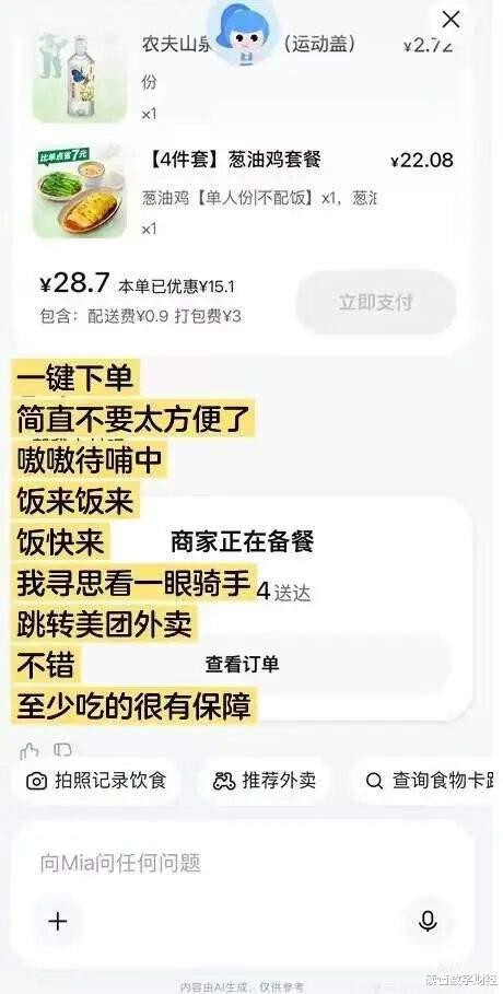美团自研的龙猫大模型的技术积累,让营养识别、个性化推荐更精准,而“对话内完成操作”的模式,也贴合了用户对便捷体验的追求。对美团而言,Mia不仅能挖掘外卖存量用户的新价值,还能承接健康消费趋势,拓展本地生活服务的边界。
